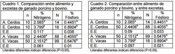 Resultados: El contenido de nitrógeno y fósforo es significativamente mayor (P<0.05) en el excremento que en el alimento del ganado porcino, en el caso de las excretas de cerdos sus valores de nitrógeno y fósforo son significativamente mayores (P<0.05) a los encontrados en las excretas de bovinos.