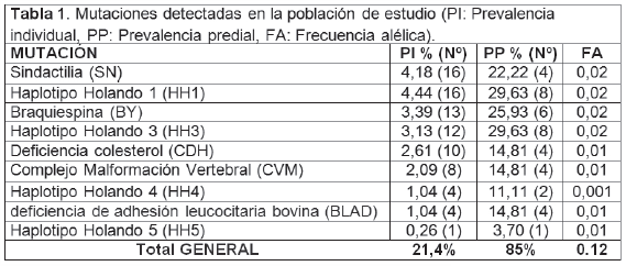Se destaca la alta frecuencia de terneros portadores de al menos una mutación letal o semiletal (21,4%), la alta frecuencia de predios afectados (85.2%) y la variedad de mutaciones encontradas (9 en total; Tabla 1). Para una frecuencia alélica de 0.12 y una población de 425000 vacas lecheras servidas anualmente en Uruguay, las muertes embrionarias, fetales y perinatales pueden estimarse (Rodriguez y col., 2009) en más de 6190 animales/ año, pérdida probablemente más alta que cualquier otra etiología considerada individualmente.