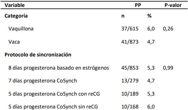 Para cumplir el objetivo 1 se analizó el % de PP entre el día 30 y ≥60 de gestación, mediante ultrasonografía (Aquila Pro Vet Esaote®., Maastricht, NL o Easy Scan go®, IMV imaging, France), en 615 vaquillonas Angus preñadas (15 meses de edad, n=457; 22 meses de edad, n=158) pertenecientes a 6 rodeos y 873 vacas Angus preñadas, ambas categorías, pertenecientes a 16 rodeos de la región central de la Cuenca del Salado. Ambas categorías fueron inseminadas a tiempo fijo bajo 4 tipos diferentes de protocolos de sincronización de celo y ovulación = 8 días progesterona basado en estrógenos [n=853 (vaquillonas, n=409; vacas, n=444)], 7 días progesterona CO-Synch (n=279, solo en vacas); 5 días progesterona CO-Synch más reCG [n=190 (vaquillonas, n=111; vacas, n=79)] y 5 días progesterona CO-Synch sin reCG [n=168 (vaquillonas, n=96; vacas, n=72)]. Se utilizó como criterio de preñez positiva la presencia del embrión/feto y el latido cardiaco. Se consideró como PP la pérdida de gestación al segundo diagnóstico. Para el objetivo 2 se utilizó la CC (escala de 1 a 5) al momento de iniciar el protocolo de sincronización de celo y ovulación sobre el porcentaje de PP. La CC en vacas se categorizó como óptima (≥3) y sub-óptima (< 3). Los datos fueron analizados utilizando el programa estadístico SAS®. El efecto de la categoría, el protocolo de sincronización de la ovulación y la CC sobre la PP en vacas fue analizado utilizando Proc GLIMMIX, considerando el rodeo como efecto aleatorio. Se utilizó un semen congeladodescongelado de un toro por rodeo.