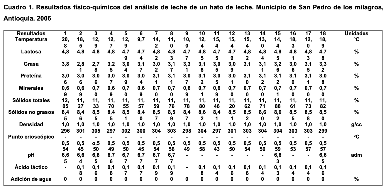 El cuadro 1, presenta los resultados del análisis físico - químico reportados para cada una de las muestras de leche de un hato del municipio de San Pedro de los milagros del departamento de Antioquia en el año 2006.