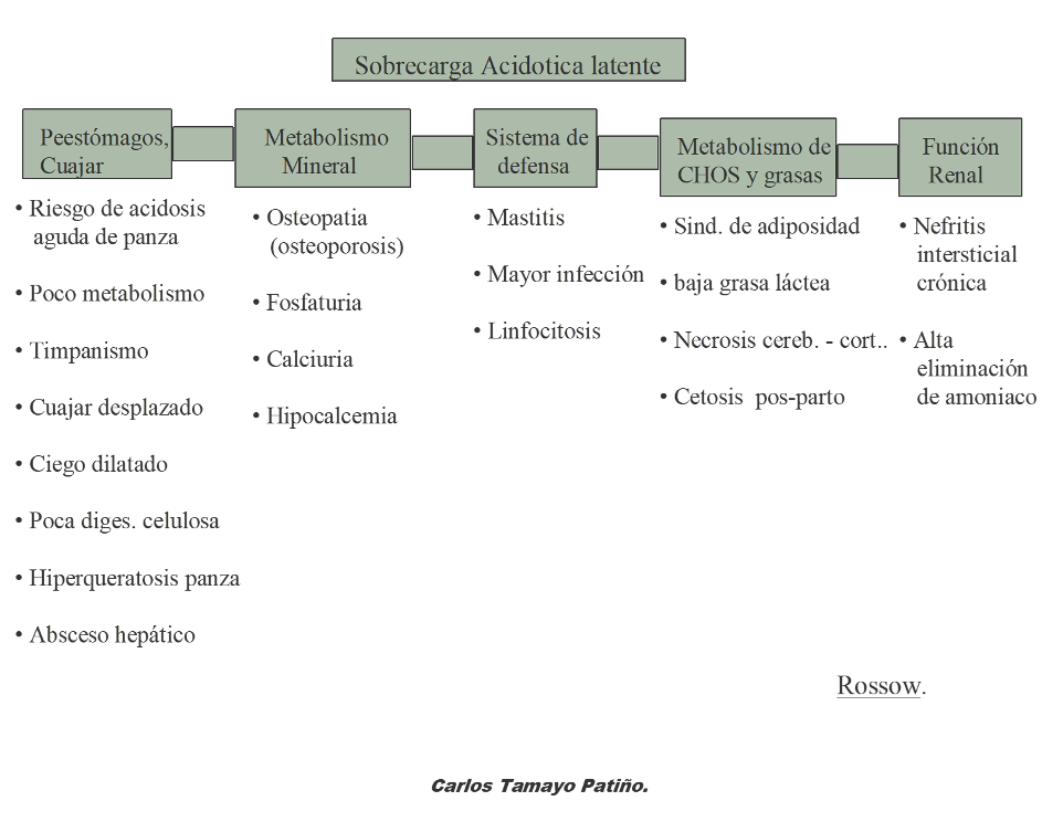 La palabra patografía se aprovecha en este artículo para llamar la atención que probablemente, en los hatos lecheros de Antioquia, las vacas en producción y dentro de ellas las recién paridas, presentan cuadros digestivos, con mayor énfasis los ruminales, que comprometen varios órganos en una o varias vacas, es más una hembra puede estar con dos o más órganos afectados. Rossow (15), lo resume muy bien en el siguiente cuadro al abordar la sobrecarga acidótica latente:
