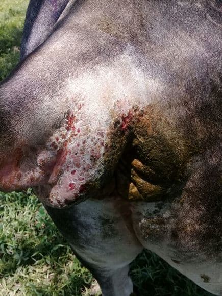 Hola buena tarde. En ése animal la lesión es una sola inflamación en el ano, o tiene más lesiones en otra parte del cuerpo -como si fueran granos-? Puede guiarse en la fotografía que subí del semental bovino, y de ahí partir para un diagnóstico presuntivo y sugerir un tratamiento. Quedamos a sus órdenes.