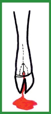 Se canaliza la vena y se evacua la mayor cantidad de sangre posible. Luego se inyectan 10 ml de solución de anestésico de uso local. Se deja la ligadura por unos 10 minutos.
