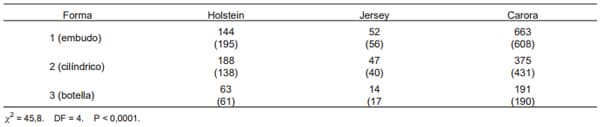 De las vacas de la raza Carora evaluadas para la FPE 1213 del total de PAD eran 634 (51,50%) en forma de embudo, 380 cilíndricos (31,32%) y 199 (16,40%) en botella. En vacas Holstein de los 389 PAD, 175 (44,98%) eran cilíndricos, 142 (36,50%) en embudo y 72 (18,50%) en botella. Para las Jersey, la disposición de los 110 PAD evaluados fue la siguiente: 50 (45,55%) en embudo, 39 (35,45%) cilíndricos y 21 (19,09%) en botella (TABLA I y FIG. 1). De 1243 PAI se observaron en la raza Carora 638 (51,70%) en forma de embudo, 388 cilíndricos (31,40%) y 208 (16,90%) en botella. En vacas Holstein, de los 387 PAI 175 (45,10%) eran cilíndricos, 140 (36,10%) en embudo y 72 (18,80%) en botella. En las Jersey, de los 111 PAI, la disposición era: 51 (46,00%) en embudo, 40 (36,00%) cilíndricos y 20 (18,00%) en botella (TABLA II y FIG. 2).