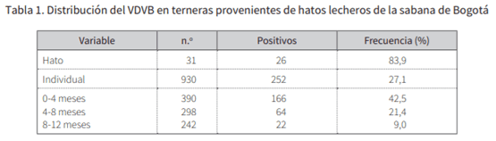 Es muy importante anotar que debido a que este es un estudio de factores de riesgo a partir de un único muestreo, los resultados deben ser interpretados con precaución. Sin embargo, representan una importante contribución en el conocimiento de la epidemiologia del VDVB en nuestro medio. En Colombia no existe un programa de control oficial o de erradicación del VDVB. Por ello es importante avanzar en el estudio de los factores asociados con la exposición al virus, con el fin de tomar medidas efectivas de control y prevención y así disminuir las pérdidas económicas ocasionadas por las consecuencias clínicas de la enfermedad.