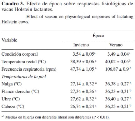 lechero comercial con solo sombras en los corrales de producción, asperjando agua antes de la ordeña. Se tomaron medidas fisiológicas y productivas durante 30 d en la época más intensa del verano (Julio: 83.3 unidades de ITH) para compararlas con el invierno (Febrero: ITH promedio de 58.3 unidades). Las temperaturas de la piel en costado derecho, nalga, ubre y cabeza, así como de la leche, fueron 10 ºC más altas (P<0.05) en verano. La tasa respiratoria fue dos veces mayor (106.87 ± 0.05 vs. 47.74 ± 0.06; P<0.05) en verano, mientras que la temperatura rectal fue 1.6 ºC mayor (P<0.05) en verano. Las concentraciones de colesterol y TAS fueron menores (P<0.05) en verano, mientras que la glucosa, TOS e IEO fueron mayores (P<0.05) en la misma época (Cuadro 3-4). La producción de leche se redujo en más del 100% (P<0.05) en verano, observándose reducciones de 42.6% en la producción de energía en leche y de 48.4% en la producción de leche ajustada a 3.5% de grasa (Cuadro 3- 4). Se concluye que el efecto del EC es evidente y tiene un efecto perjudicial en la fisiología y productividad de vacas Holstein en producción, lo que hace necesario utilizar innovaciones ambientales para reducir este impacto negativo de las altas temperaturas (Anzures et al., 2015).