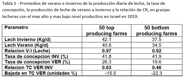 Al comienzo de cada año, recibo los datos de todas las granjas lecheras en Israel. Para examinar la relación entre el nivel de producción de leche y el enfriamiento intensivo de las vacas en el verano, seleccioné de esta base de datos las 50 granjas lecheras con la mayor producción anual de leche en 2019, y las comparé con las 50 granjas lecheras con la menor producción anual. La producción diaria promedio de leche por vaca en el verano y el invierno, la relación de producción de verano a invierno, la tasa de concepción en las dos estaciones y la relación CR de verano a invierno se presentan en la tabla 1.