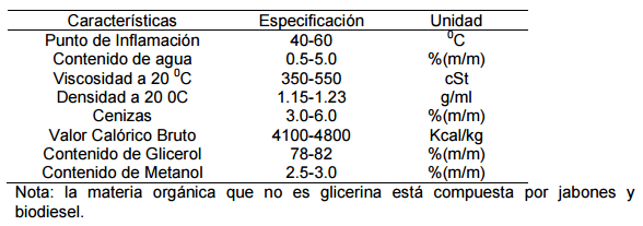 Cuadro 8. Características físico-químicas de la Glicerina Cruda (gentileza de ALUR S.A.)