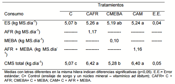 Cuadro 6: Consumo de ensilaje de sorgo (ES), activador de la fermentación ruminal (AFR), microorganismos eficientes benéficos activados (MEBA), AFR y MEBA y consumo total (CMS) en terneras holando alimentadas con ensilaje de sorgo como dieta base.