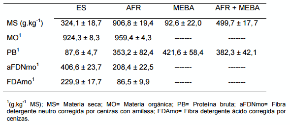Cuadro 3: Composición química de ensilaje de sorgo (ES), activador de la fermentación ruminal (AFR), microorganismos eficientes benéficos activados (MEBA) y AFR y MEBA utilizados en el experimento.