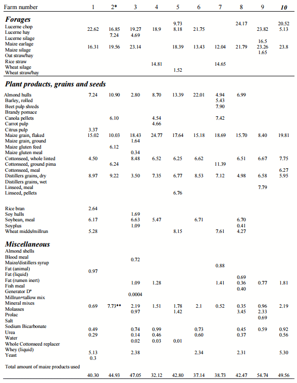 Cuadro 1 Perfil de ingredientes (g/100 g DM) en dietas de grupos de alta producción en 10 tambos de California (Adaptado de Swanepoel et al., 2010)
