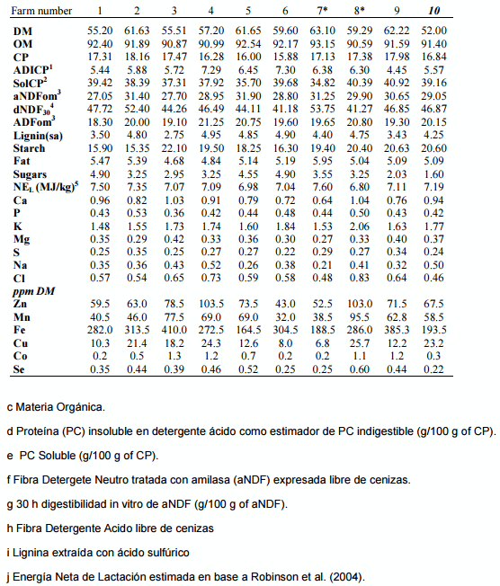 Cuadro 2 Composición química de las dietas de grupos de alta producción en 10 tambos de California (Adaptado de Swanepoel et al., 2010)
