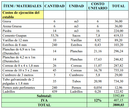 A continuación, se detalla los materiales que se necesitan para la construcción del establo para producción de ganado de leche: