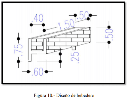 El área total que comprende la zona de alimentación (Figura 9) para vacas de leche es de 25m2 (2.5m x 10m) y para toros de engorde un área de 30m2 (2.5m x 12m). El piso de esta zona es de hormigón con ligera pendiente de 2 al 3% con dirección a la zona de descanso, con el propósito de facilitar la limpieza (Figura 8). Así mismo, está previsto de bebederos (Figura 10) con las dimensiones recomendadas (0.15cm/animal adulto) para la capacidad de animales que fue diseñado el establo.