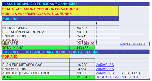 Las perdidas son de 413.437 $, el costo de aplicar un plan para actuar contra estas patologías de manejo es de 21.064 $. Esta es una de las medidas de corto financiero, suspender los gastos en manejo de estas patologías, suspenden las compras de sales, suspenden la alimentación diferencial de las vacas secas, etc, medidas que toman muchos productores y causan después un problema económico, como es la perdida de 413.437 $.