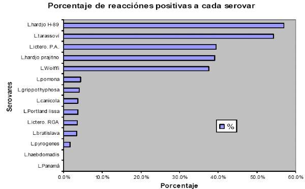 Las 6 serovariedades de mayor importancia en la zona de la Comarca Lagunera son. Hardjo H-89 (56.9%), tarassovi (54.3 %),icterohaemorrhagiae (39.4 %) hardjo prajitno ( 39.1 %), wolffi (37.6 %) y Pomona (4.4 %), detectadas mediante la prueba de Micro Aglutinación Microscópica (MAT).