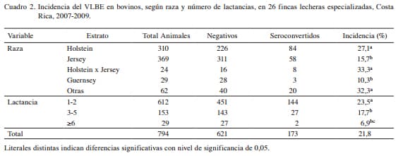 Al comparar la incidencia del VLBE en vacas según número de lactancias, se determinó que vacas en la primera lactancia mostraron los más altos porcentajes (23,5%), lo que coincide con lo reportado por Beita (2008) y Johnson y Kaneene (1991), de que la prevalencia del VLBE aumenta en forma significativa en el ganado en el momento en que los bovinos ingresan al hato en producción, ya que son sometidos a un manejo más intensivo, lo cual conlleva a un riesgo de infección, ya sea por aumento de la intervención humana (transmisión iatrogénica) o por contacto directo y prolongado con animales infectados (transmisión horizontal).