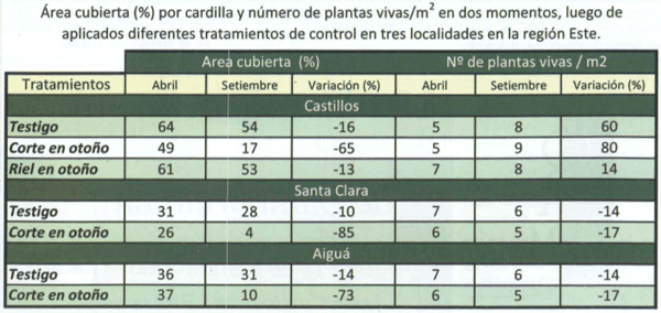 En la región Este se realizó un trabajo en tres localidades en acción conjunta entre INIA y el Instituto Plan Agropecuario, donde se comparó - entre otros tratamientos -, el efecto de cortes de otoño frente a un testigo, así como al pasaje de un riel. Las variables evaluadas fueron el área cubierta y el número de plantas de la maleza en los meses de abril y setiembre .