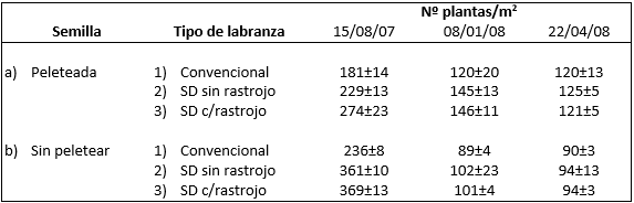 En el segundo ensayo (siembra 2008) se puede observar que el número de plantas logrados (Figura 2) estuvo influenciado por el tipo de tratamiento del suelo previo a la siembra (mayor en la convencional, luego la directa sin rastrojo y por último la directa con rastrojo en superficie) y a su vez dentro de estos se nota el efecto positivo de usar semilla peleteada sobre el número de plantas logradas. Este resultado fue diferente al año anterior donde los tratamientos con labranza convencional habían tenido un menor número inicial de plantas.