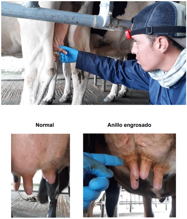 Para evaluar este punto, no se deben tomar en cuenta las vacas con edema de parto. A la palpación, la punta del pezón debe ser suave y flexible en condiciones normales, y dura, firme o en forma de cuña bien marcada cuando se encuentra afectada (Mein et al., 2001).