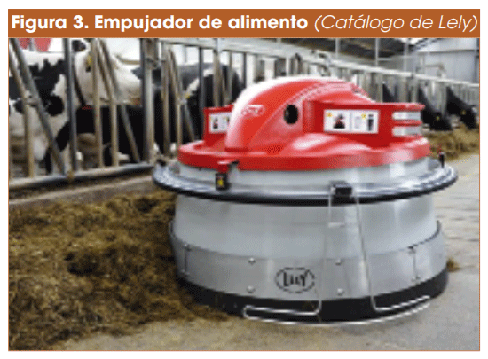 También podemos considerar ganadería de precisión el uso de dispositivos y máquinas que sustituyen total o parcialmente al ganadero en tareas repetitivas y pesadas; los ejemplos más claros son el robot de ordeño, los robots que empujan el alimento en el comedero varias veces al día (Figura 3), limpiadores de pasillos (Figura 4), o las instalaciones automatizadas para la preparación y distribución de las raciones unifeed (Figura 5).