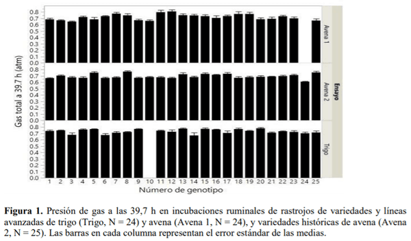 Se recolectaron rastrojos de líneas avanzadas y variedades de trigo (Ensayo Trigo) y de avena (Ensayo Avena 1), y de variedades históricas de avena (Ensayo Avena 2) en parcelas experimentales en INIA Carillanca en marzo de 2019. Se analizó la composición química proximal (AOAC, 1995), y 500 mg de cada rastrojo molido a través de un tamiz de 1 mm fueron incubados y agitados por 72 h bajo CO2 a 39 °C y 60 rpm con 40 mL de fluido ruminal de dos vacas Holstein y medio de cultivo (Mould et al., 2005) en proporción 1:2 (V/V). Se determinó presión total del gas a 0, 2, 3, 6, 9, 12, 18, 24, 38, 48 y 72 h. Al final de las incubaciones se determinó pH, se centrifugó el contenido de las botellas a 12.520 × g por 15 min, el pellet se secó a 60 °C por 120 h, y se determinó la digestibilidad aparente de la materia seca a las 72 h (DMS).