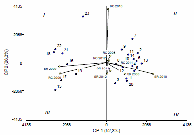 El promedio general para la producción de materia seca acumulada fue de 3.188 ± 193,6 kg ha-1, con rango de variación entre 2.949 y 3.601 kg ha-1. Las diferencias fueron significativas (p<0.01) para los efectos principales G (F=2,1), A (F=150,9) y para la IGA (F=3,3). El análisis de la regresión ubicó como rendidores y estables a los triticales 8, 7, 9, 2 y 1 y los tricepiros 20, 18, 16 y 21 dado que están dentro de la banda de confianza (Figura 1). Los modelos AMMI analizan los efectos principales de genotipos (G) y ambientes (A) mediante ANAVA y la IGA se estudia en forma multivariada a través de un gráfico bidimensional o biplot. Los dos primeros componentes principales (CP) explicaron el 78,6% de la variabilidad debida a la IGA (Figura 2). El ambiente SR 2010 tuvo una importante contribución positiva a la interacción y presentó mayor asociación con los genotipos de triticale 13, 5, 6 y 4. La contribución del ambiente RC 2010 fue significativa en el CP2 y se asoció con el tricepiro 23. El genotipo más estable fue el triticale 8. El modelo SREG adiciona los efectos lineales de los genotipos al término multiplicativo de la IGA (GGE). Los dos primeros CP explicaron 76,6% de la variabilidad debida a la IGA. Seis de los 10 ambientes se ubicaron cercanos al origen (0,0) indicando tener una baja participación en la contribución a la interacción GA. En el sector derecho superior se ubicó el ambiente SR 2009 como de alta participación en el modelo y las líneas de tricepiro 18, 22 y 21 fueron las que tuvieron mayor respuesta en ese ambiente. El genotipo 16 de tricepiro tuvo alta puntuación en el CP1 y muy baja o nula IGA (puntuación cercana a 0 en el CP2).