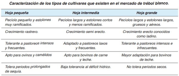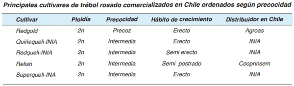 Cultivares: Chile posee una importante oferta de cultivares de esta especie, donde la demanda ha evolucionado hacia tréboles de tipo ladino (hoja grande) y hoja intermedia, situación no muy adecuada dado que, en general, los tréboles de hoja grande poseen baja densidad de estolones y poca persistencia.
