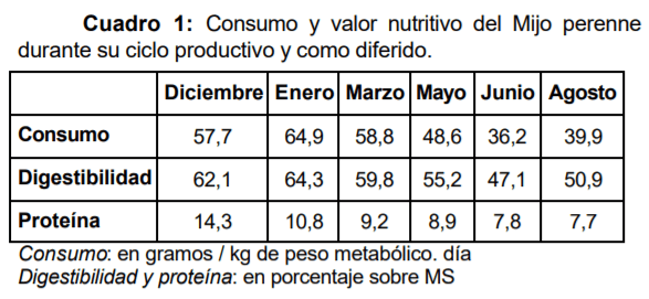 La calidad del forraje producido es muy alta durante toda la estación de crecimiento alcanzando valores superiores al 14% de proteína bruta en diciembre y también conserva buena calidad, en términos comparativos, cuando es diferida hacia el invierno. En el Cuadro 1 puede verse información detallada del valor nutritivo del Mijo perenne.