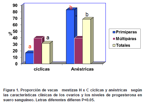 En la Figura 1, se muestran los resultados del diagnóstico clínico ginecológico y endocrino del estado de la actividad ovárica realizado. Se encontró una diferencia significativa P<0.001 entre la proporción de vacas cíclicas o anéstricas. De acuerdo con estos hallazgos, el 31.6% de las hembras mostraron cíclicidad ovárica y no fueron detectadas. Ello, obviamente estuvo asociado a los problemas de manejo y los errores humanos en la detección de los signos del.
