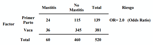 La interpretación es que los animales de primer parto tienen dos veces más posibilidades de presentar casos de mastitis comparados con aquellas vacas multíparas, y es estadísticamente significativo. Esta aproximación epidemiológica permite establecer causalidad y permite definir algunos factores de riesgo en este caso en comparaciones de casos y controles.