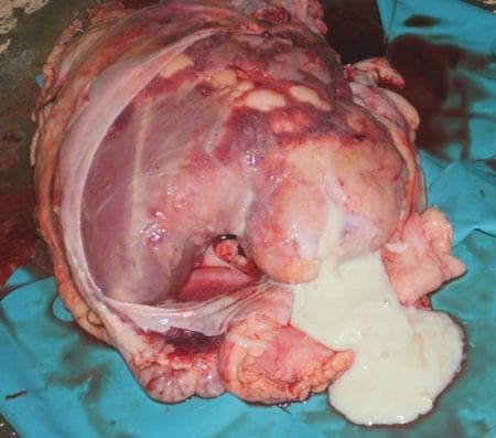 Al abrir la cavidad pericárdica se observó hemorragias equimóticas y adherencias en el epicardio y un absceso de gran tamaño completamente encapsulado adherido a la pared externa del ventrículo izquierdo pero sin comunicación con la cavidad ventricular.