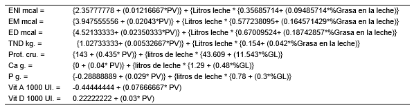 Y para las necesidades de producción el porcentaje de grasa de la leche como variable independiente, en oposición a los valores de; Energía, proteína cruda, minerales y vitaminas, como variables dependientes.