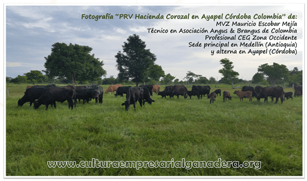 Pero, queremos aprovechar el contenido específico de esta publicación para aludir a la experiencia del MVZ Mauricio Escobar Mejía (autor principal del presente artículo), no solo como técnico de la Asociación Angus & Brangus de Colombia sino también como asesor el país de proyectos Silvopastoriles y de Pastoreo Racional Voisin (PRV y SPRV) considerados como dos de las tecnologías que permiten aplicar idóneamente las leyes y demás componentes de la tecnología que fundó Voisin, y especialmente, como asesor de un proyecto particular en el municipio de Ayapel (Córdoba, Colombia) en el cual se trabaja la tecnología PRV con ganado de la raza Angus, Brangus y sus cruces, advirtiendo que este tipo de ganado que posee unas cualidades superiores a los cebuínos comerciales habitualmente manejados en las ganaderías de carne, responden positivamente en igualdad de condiciones de pastoreo al manejo PRV; claro está, que siempre y cuando la raza y/o el cruce estén en el medio ambiente que le corresponde, los resultados en los parámetros antes mencionados son bastante exitosos.