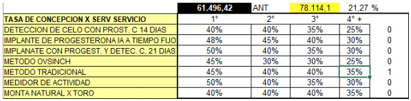 Veamos como varia el costo si sube la TDC 75 %, la tasa de concepción a los distintos servicios , 1° servicio 50 %, 2 ° servicio 45%, 3 ° servicio 40 %, 4 ° y más servicios 35 %
