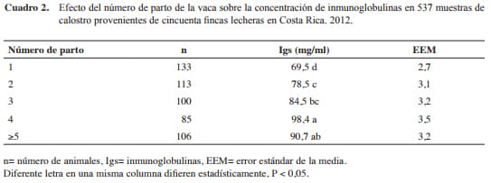 Se ha sugerido que el calostro producido por animales de primer parto (novillas), generalmente tiene una concentración menor de Igs que el producido por vacas con mayor número de partos. Una de las razones es que las novillas han sido expuestas a antígenos por menor tiempo que vacas con más lactancias. Además, el menor desarrollo mamario que presentan las novillas en los primeros partos podría generar un reducido mecanismo de transporte de Igs hacia la glándula mamaria, comparado con el de las vacas adultas (Moore et al., 2005; Gulliksen et al., 2008; Kehoe et al., 2011).