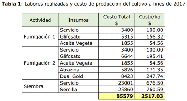 La siembra se realizó el 14/12/2017 a una densidad de 8 semillas/m lineal aproximadamente y un distanciamiento entre surcos de 52 cm. El cultivo no fue fertilizado y se hicieron dos aplicaciones de agroquímicos para el control de malezas previo a la siembra. Las labores realizadas y el costo de producción del cultivo de sorgo, se presentan en la tabla 1.