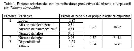 El uso de Tithonia diversifolia es muy amplio en las diferentes categorías de animales. Los rumiantes se destacan respecto a las demás categorías pero la mayor parte de los resultados se han evaluado como suplemento en condiciones de corte y acarreo y muy pocas investigaciones bajo condiciones de pastoreo, de ahí la importancia de comenzar a evaluar SSP conformados por esta especie, bajo diferentes condiciones agroecológicas, como una alternativa para incrementar la producción de alimentos para satisfacer la creciente demanda internacional. El análisis de CP de las variables estudiadas (tabla 1) mostró que las primeras 3 componentes permitieron explicar el 83,02 % de la variabilidad de los indicadores evaluados. Los resultados mostraron la preponderancia de los factores reunidos en la primera componente la cual está relacionada con el tiempo de establecimiento del sistema y el número de plantones y agrupa cuatro variables.