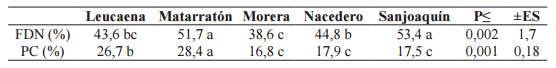En el caso del matarratón el valor de FDN presentado en la Tabla 4 es mucho mayor que el registrado en la literatura, particularmente alto cuando se considera que el follaje se cosechaba cada 90 días. Wood et al. (1998) encontraron valores de FDN comprendidos en un rango entre 29,1 y 46,6% para muestras provenientes de cinco países, pero en hojas jóvenes el rango solo fue de 31,1 a 39,1%. En cuanto a la proteína cruda, los valores sí están comprendidos en los rangos registrados por los autores precedentes (22,4 a 35,5%).