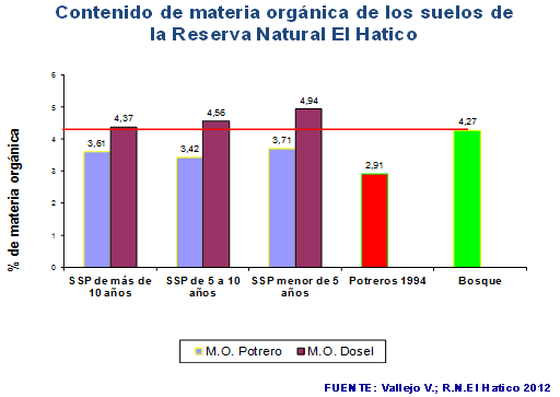 En comparación con el bosque primario nativo, existente en la misma finca, que posee el mayor contenido de materia orgánica en el suelo (4,27%), los potreros hasta 1994 tenían un contenido de materia orgánica del 2,91%, la cual se había reducido en un 31,85% con respecto al bosque. Sin embargo, en los Sistemas Silvopastoriles Intensivos se ha venido recuperando de nuevo el contenido de materia orgánica en el suelo a medida que transcurren los años, acercándose cada vez más a su contenido en el suelo del bosque nativo.(Figura 6.)