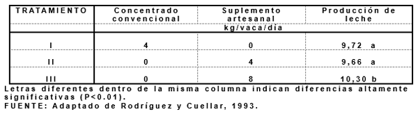El análisis estadístico se realizó por covarianza, tomando en cuenta la producción inicial de cada vaca. La producción de leche lograda por el grupo de vacas que consumió 4 kg/vaca/día del concentrado convencional (tratamiento I) fue similar a la del grupo de vacas que consumió 4 kg del suplemento artesanal (tratamiento II).