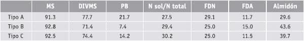 (3) El nivel del almidón (energía) de la Raicilla o Pellet de Cebada “tipo A” varía entre el 28 al 35% de la MS total (Tabla 2), dependiendo de la proporción de grano partido y entero de menor tamaño que contenga en su seno. Mientras que en los AB comerciales, considerando aquellos que tienen en su composición una alta proporción de granos de cereal (30-40%), hecho que no es muy común, el nivel de almidón puede alcanzar los 26-28% sobre base seca.
