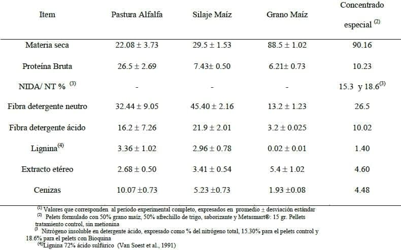 La calidad de los componentes de las dietas fueron muy aceptables, incluso con valores superiores a la media de la región, se destaca la elevada concentración de proteínas de la pastura de alfalfa. El concentrado especial con Bioquina® mostró un valor más elevado de NIDA/%NT, lo cual es esperable por el agregado de taninos.