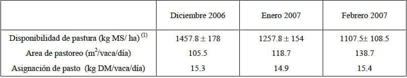 Tabla 2: Disponibilidad de biomasa de alfalfa, área de pastoreo diaria y materia seca asignada durante el período experimental (promedio ± DS).