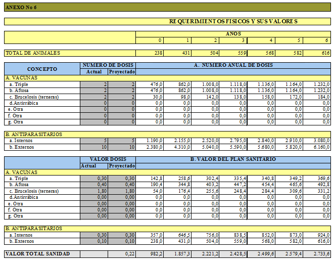 Inventario del ganado existente con especificación de razas, edades y condiciones del hato, duración de la lactancia, porcentaje de natalidad, descarte vacas, destete efectivo, mortalidad de ganado adulto, porcentaje de abortos, vacas en producción sobre el total de vacas, edad reproductiva, producción de leche vaca día, incremento peso día, incrementos anuales sostenidos hasta la estabilización del proyecto. Requerimientos de compra de ganado, análisis de precios de mercado de insumos y productos.