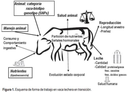 El conflicto en el desempeño productivo vs el reproductivo está en gran parte condicionado por el manejo diferencial en el que se puede incidir especialmente durante el período de transición. A la alta demanda metabólica por producción de leche se le suma la disminución (~ 30%) del consumo previo al parto (Grummer, 1995) que promueve la movilización de reservas corporales, es decir, el balance energético negativo (BEN). Los cambios que ocurren durante este período están directamente relacionados a los procesos de adaptación del sistema digestivo a la alimentación que recibirán luego del parto y del metabolismo. Los cambios en el metabolismo de los tejidos/órganos del cuerpo necesarios para apoyar una función fisiológica específica (homeorhesis, Bauman y Currie, 1980), aseguran la uniformidad del flujo de nutrientes en apoyo de la lactancia. Esta partición de nutrientes es comandada por señales hormonales que en conjunto con los perfiles metabólicos pueden ser utilizados como herramientas predictivas del estado de salud de rodeo. En ese estado fisiológico las vacas lecheras de alta producción tienen una utilización de nutrientes por parte de la glándula mamaria superior a la del resto del cuerpo, a tal extremo que Brown (1969) ha sugerido que la vaca debe ser concebida como un apéndice de la ubre y no viceversa. Este tiempo de sub-alimentación experimentado por los animales al inicio de la lactancia no solo afecta la magnitud de la respuesta residual de producción en toda la lactancia, sino que agrava el desempeño reproductivo. Es en este período que se concentran las enfermedades metabólicas o tecnopatías de la producción de leche actual. Del equilibrio con que la vaca resuelva este proceso dependerá la capacidad de maximizar la producción de leche, evitar enfermedades metabólicas y asegurar la siguiente preñez (Grummer, 1995).