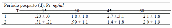 Las vacas incluidas en el estudio tuvieron 1.8 ± .83 partos; el peso preparto fue 612.6 ± 49.0 kg, al parto 541 ± 73.9 kg; independientemente del número de partos de las vacas, el peso antes y 15 d pp fue igual (P>.05). En cuanto al peso corporal de los animales, no hubo diferencia entre tratamientos en los periodos evaluados (P>.05). La CC fue diferente (P<0.05) entre grupos únicamente a los 15 d pp . Respecto a la actividad ovárica, los niveles de P4 durante el pp fueron: 1.4, 2.0 y 2.0 ng/ml a los 30, 45 y 60 d pp, respectivamente. A los 15 d pp, las vacas permanecieron inactivas ováricamente. De acuerdo a los niveles de progesterona sérica ≥1 ng, 39% de las vacas reanudaron la actividad ovárica a los 30 y 45 d pp; el 56.2% de los animales presento actividad en el último periodo evaluado (60 d pp). El comportamiento reproductivo de los animales (Tabla 1) fue igual entre grupos (P>.05) excepto para los días abiertos en donde si hubo diferencia entre grupos (P<.05)