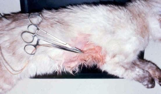 Toracocentésis en un perro con derrame pleural; la toma de muestras permite el análisis y, con mucha frecuencia, el diagnóstico de la causa del derrame, proceder hasta el vaciado casi completo de la cavidad pleural permite mejorar la capacidad ventilatoria del paciente y estabilizar el cuadro respiratorio, al menos temporalmente.