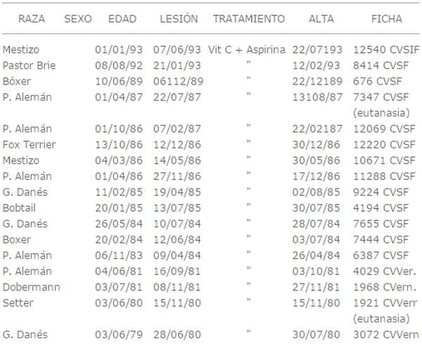 El primer caso que diagnosticamos fue en 1980, el perro había nacido en 1979. Hemos diagnosticado 17 casos hasta 09/1993. De estos 17 casos, 15 han respondido al tratamiento con vitamina C, Acetilsalicílico, dietas. Dos casos fueron eutanasiados, uno en el momento del diagnóstico, dado el estado degenerativo del animal, y otro a los 10 días del tratamiento, al no responder en absoluto a la terapia.