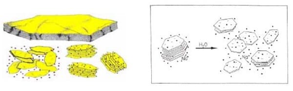 El proceso de activación de minerales arcillosos consta de varios pasos, que incluyen trituración, secado y activación química. En la práctica, las capas de sílice de la arcilla se reducen a partículas más pequeñas, aumentando la superficie, cambiando el tamaño de los poros entre las placas y afectando la distribución de las cargas (Figura 1). Este proceso se puede controlar para proporcionar un producto con la máxima adsorción de micotoxinas (Van Dyck et al., 2004).